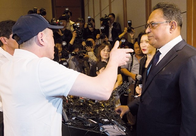 가습기 살균제 피해자 가족들이 2일 오전 서울 여의도에서 열린 옥시 공식 기자회견장에서 옥시레킷벤키저 한국법인 아타 샤프달 대표에게 항의하고 있다.