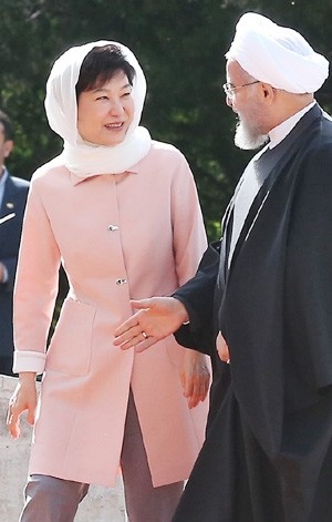 이란을 국빈 방문 중인 박근혜 대통령이 2일 오전(현지시간) 테헤란 사드아바드 좀후리궁 광장에서 열린 공식 환영식에서 하산 로하니 이란 대통령과 대화를 하며 이동하고 있다.