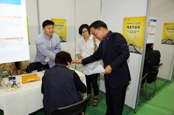 최근 경기 안성시의 ‘2016년 제1회 안성맞춤 채용박람회’가 한경대학교 체육관에서 고등학생과 대학생을 비롯해 노인, 여성, 장애인 등 1200여명이 참여한 가운데 개최됐다. 사진은 황은성 시장(맨 오른쪽)이 박람회를 찾은 주민과 이야기를 나누는 모습.(사진제공=안성시청)