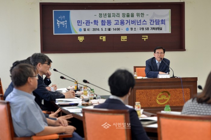 지난 2일 동대문구는 청년실업 문제 해결을 위해 ‘민·관·학 합동 거버넌스 고용간담회’를 구청 5층 기획상황실에서 개최했다. 사진은 유덕열 구청장(가운데)과 관계자들이 간담회를 진행하고 있는 모습.(사진제공=동대문구청)