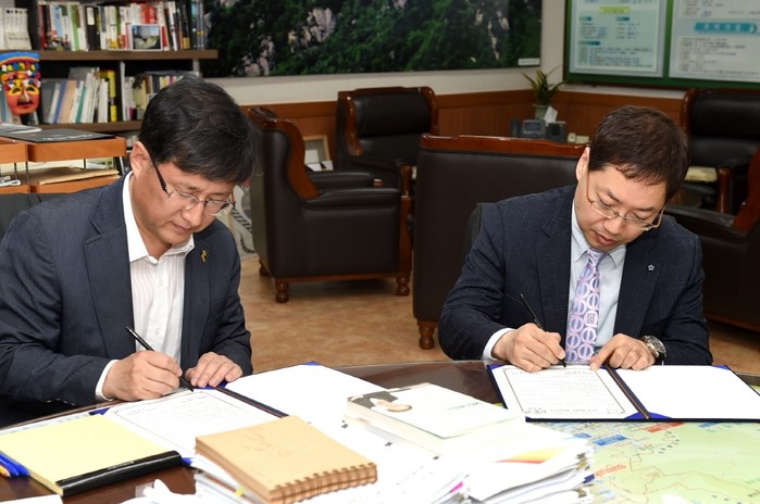 김성환 서울 노원구청장(왼쪽)이 3일 오전 9시30분 구청장실에서 언어 생활 개선과 공공언어 바르게 쓰기를 위한 업무협약식에서 최형용 이화여자대학교 국어문화원장과 함께 협약서에 서명을 하고 있다.(사진제공=노원구청)