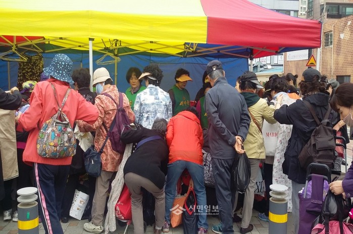 최근 서울 서초구 서초4동 새마을부녀회는 방배동 복개도로에서 벼룩시장을 개최했다. 사진은 이날 행사에 참석한 주민들이 옷을 고르는 모습.(사진제공=서초구청)
