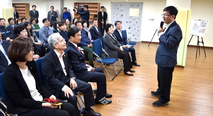 김성환 서울 노원구청장(오른쪽)은 3일 오후 3시 상계동 온수골 행복발전소에서 열린 상계청소년문화의집 건립 관련 주민설명회에 참석해 인사말을 하고 있다.(사진제공=노원구청)