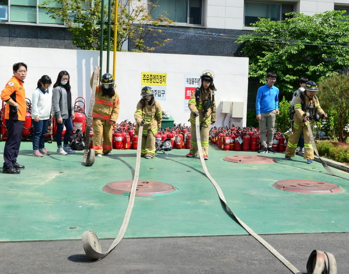 지난 2일 서울 영등포소방서는 윤중중학교 학생들을 대상으로 소방관 진로탐색과 직업을 체험하는 '미래소방관 체험 교실'을 운영했다. 사진은 참여 학생들이 소방복을 입고 소방호스 연장 훈련을 실시하는 모습.(사진제공=영등포소방서)