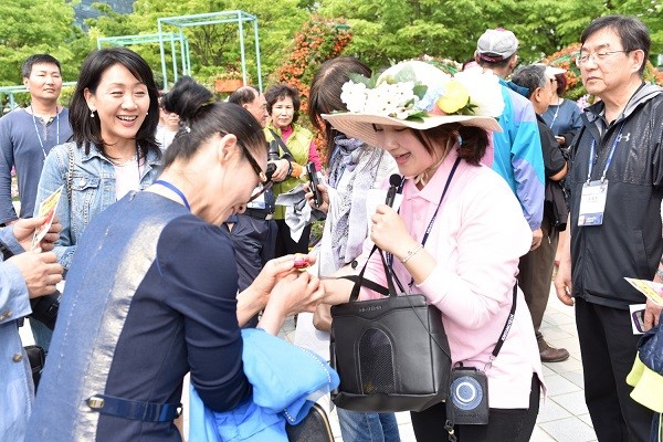 | ▲ 사진제공=고양시청/사진설명: 투어 후 즉석 퀴즈이벤트에 참여해 꽃씨를 선물받는 관람객. | ||