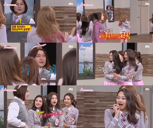 이 모습에 아이오아이의 멤버 주결경은 "무섭다"며 김도연의 손을 꼭 붙잡았고 김도연은 "얼굴이 왜 이렇게 커"라고 말하며 놀라움을 숨기지 못했다.
