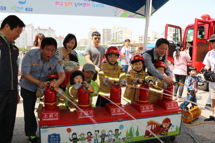 최근 경기 군포소방서는 군포시 시민체육광장에서 어린이와 시민들을 대상으로 119안전체험마당을 운영했다. 사진은 행사에 참석한 어린이들이 소화기 사용 실습을 하는 모습.(사진제공=군포소방서)