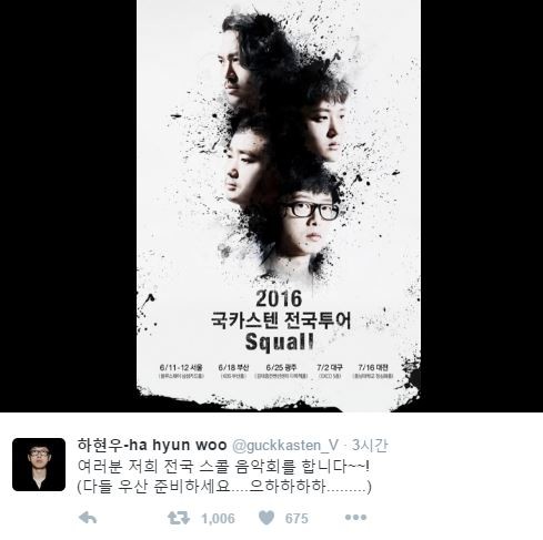 하현우는 9일 본인의 트위터에 "여러분 저희 전국 스콜 음악회를 합니다. 다들 우산 준비하세요"라는 글과 함께 한 장의 사진을 게재했다.