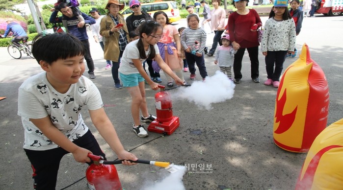 최근 동작소방서는 '어린이날'을 맞이해 보라매공원에서 '찾아가는 소방안전교육'을 실시했다. 사진은 행사에 참석한 어린이들이 소화기 사용 실습을 하는 모습.(사진제제공=동작소방서)