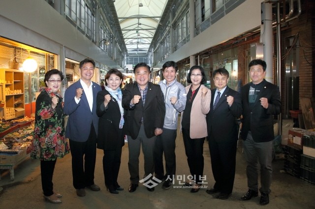 | ▲ 사진은 정대근 전통시장특별위원장(왼쪽에서 네 번째)과 특위위원들이 구로시장에서 기념촬영하는 모습.(사진제공=구로구의회) | ||
