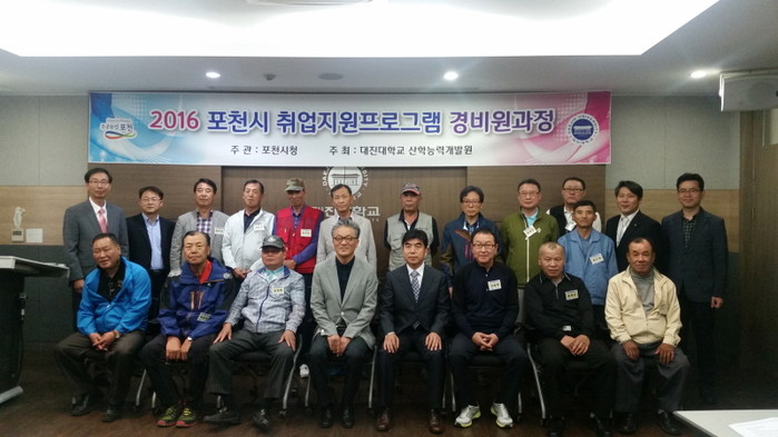 지난 9일 경기 포천시는 대진대학교 산학능력개발원 국제학관에서 고령자 맞춤형 취업프로그램인 '2016년 포천시 고령자를 위한 경비원취업과정'을 개강했다. 사진은 교육 참가자들이 기념촬영하는 모습.(사진제공=포천시청)
