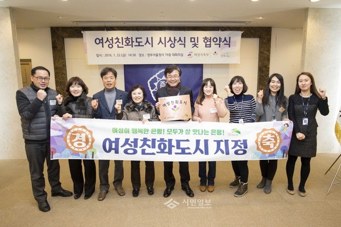 | ▲ 김우영 서울 은평구청장(가운데)과 관계자들이 구가 '여성친화도시'로 선정된 것을 축하하며 기념촬영을 하고 있다. | ||