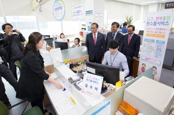 | ▲ 김우영 서울 은평구청장(뒷줄 가운데)과 홍윤식 행정자치부 장관(뒷줄 왼쪽)이 '원스톱 서비스 접수 시연행사'를 참관하고 있다. | ||