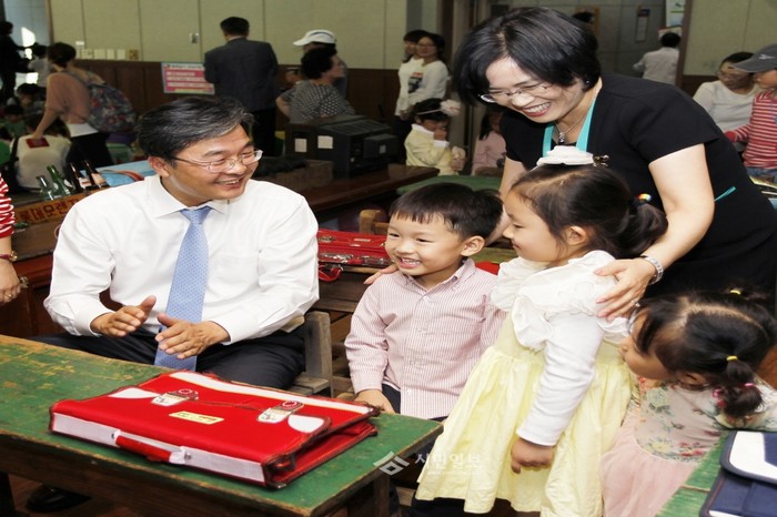 | ▲ 2013년 10월9일 서울 은평구 보육정보센터에서 개최한 '은평구어린이들의 날' 행사에 참가한 김우영 구청장(왼쪽)이 어린이들과 대화를 나누고 있다. | ||