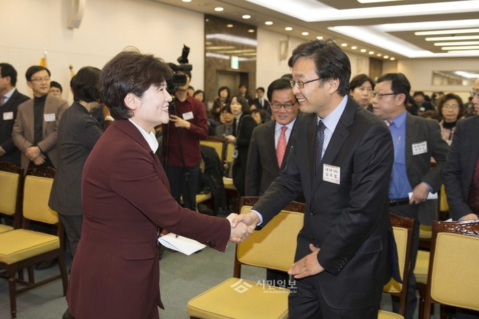 | ▲ 김우영 서울 은평구청장(오른쪽)과 강은희 여성가족부 장관이 '여성친화도시 협약식'에 앞서 악수하고 있다. | ||
