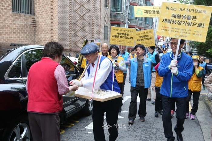 지난 10일 금천구는 독산4동 재활용정거장의 주민 홍보를 위한 '재활용정거장과 함께하는 독산4동 동네 한바퀴' 행사를 개최했다. 사진은 일일 엿장수가 된 차성수 구청장이 주민들에게 엿을 나눠주며 재활용정거장 이용을 홍보하는 모습.(사진제공=금천구청)