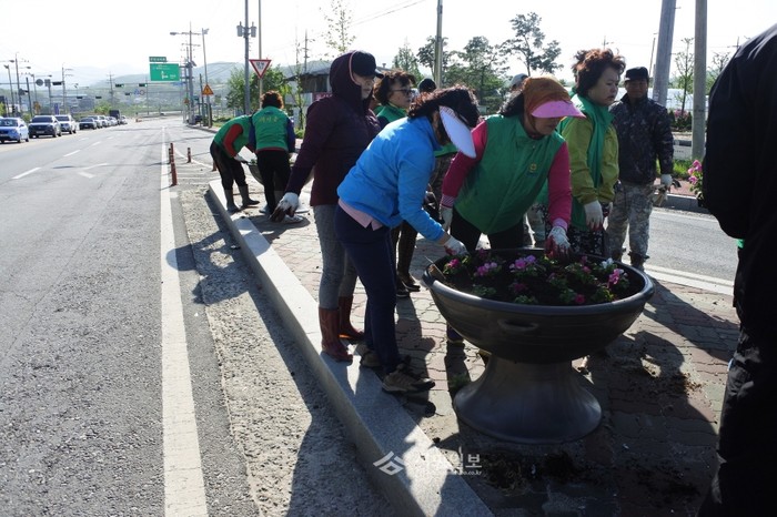 최근 경기 양주시 은현면은 지역 4개 단체(이장협의회, 주민자치위원회, 남녀새마을지도자) 회원들과 공무원, 주민 등이 참석한 가운데 면사무소, 은현교차로 등에서 ‘2016년 시민참여 꽃심기 행사’를 했다. 사진은 관계자들이 도로변 화분에 꽃을 심는 모습.(사진제공=양주시청)