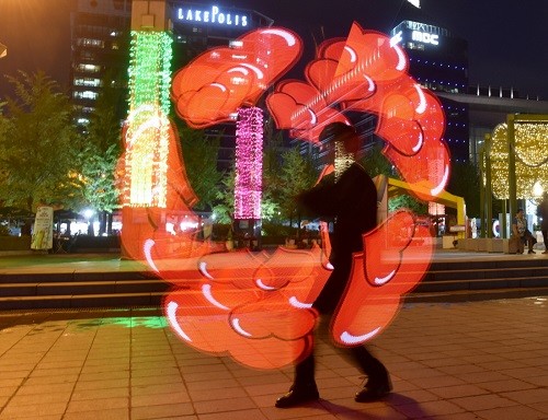 | ▲ 사진제공=고양시청/사진설명: 야간 개장한 꽃박람회장에서 ‘LED 마샬아트’ 공연이 펼쳐지고 있는 모습. | ||