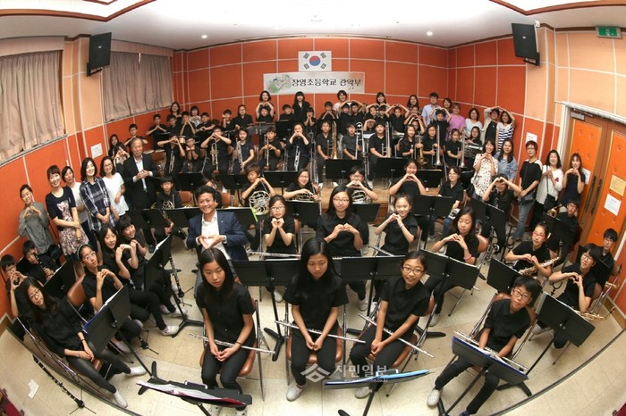 | ▲ 김만수 시장이 '부천 아트벨리 사업'에 참여한 창영초등학교 관현악반 학생들과 함께 기념촬영을 하고 있다. | ||