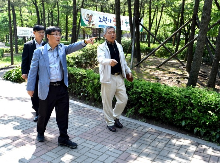 김성환 노원구청장(가운데)이 지난 11일 오전 11시 상계동 654번지 갈말근린공원 꽃길 정비사업 관련 주민설명회에 참석해 조성지를 둘러보고 있다.(사진제공=노원구청)