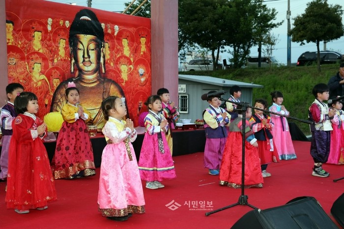 최근 전남 장흥군 탐진강변에서 개최된 부처님오신날 맞이 법요식 및 연등행사에서 불기 2560년 부처님오신날을 앞두고 고사리손을 다소곳이 모은 꼬마 불자들이 온누리에 평화와 자비가 넘치기를 기원하고 있다. (사진제공=장흥군청)