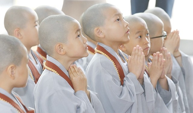 부처님 오신 날을 이틀 앞둔 12일 오전 서울 종로구 견지동 조계사에서 동자승들이 합장을 하고 있다.