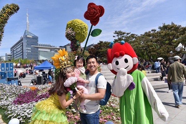 | ▲ 사진제공=고양시청/사진설명:아빠와 함께 꽃박람회를 방문한 어린이가 꽃박람회 마스코트 ‘코코’와 플라워 포토걸과 기념사진을 찍으면 즐거운 시간을 보내고 있다. | ||