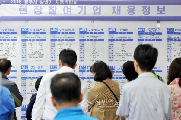 최근 경기 광주시는 시청 2층 로비에서 구직희망자 400여명이 참여한 가운데 '일 잡(JOB)고! 희망 드림(Dream)!'이라는 주제로 '2016 광주시 상반기 채용박람회'를 개최했다. 사진은 박람회 방문자들이 채용정보를 살펴보는 모습.(사진제공=광주시청)