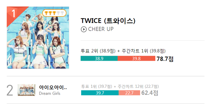 16일 오후 3시에 공개된 5월2주차 주간인기상 결과에 따르면 TWICE (트와이스)는 투표 2위(38.9점)+주간차트 1위 (39.8점)를 기록하며 1위 자리를 유지했다.