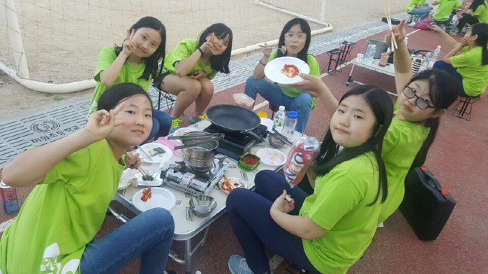 경기 가평군 청평초등학교 컵스카우트는 지난 13~14일 미원초등학교에서 뒤뜰야영을 실시했다. 사진은 행사에 참석한 어린이들이 식사를 하면서 기념촬영을 하는 모습.(사진제공=가평교육지원청)