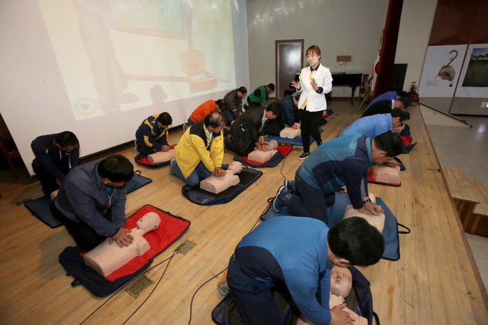 최근 서울 송파구는 송파여성문화회관 6층 실버뜨락에서 환경미화원들을 대상으로 2016년 상반기 청소종사원 직무교육을 실시했다. 사진은 교육에 참여한 미화원들이 심폐소생술 실습을 하고 있는 모습.(사진제공=송파구청)