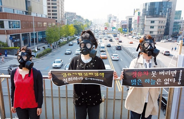 16일 오전 서울 한남대교 북단 육교 위에서 서울환경연합 관계자들이 미세먼지 문제의 근본 대책 마련을 촉구하는 캠페인을 벌이고 있다.