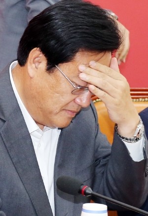 새누리당 정진석 원내대표 겸 비상대책위원장이 16일 오전 국회 원내대표실에서 열린 비대위원 상견례에서 잠시 생각에 잠겨 있다. 박근혜 대통령과 여야 3당 원내대표간 청와대 회동 이후 화두로 떠올랐던 ‘협치(協治)’가 ‘님을 위한 행진곡’에 대해 국가보훈처가 16일 기념곡 지정과 현행 합창에서 제창 방식으로의 변경도 불가하다는 입장을 밝혀 위기를 맞고 있다.