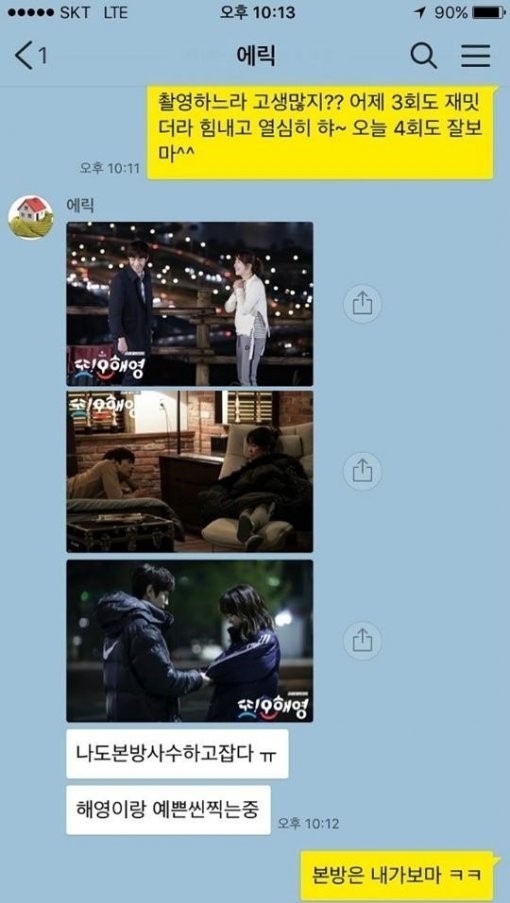 이어 에릭은 서현진과의 다정한 촬영 현장 사진을 연달아 보내며 “나도 본방사수 하고 싶다. 해영이랑 예쁜 씬 찍는 중”이라고 자랑했다.