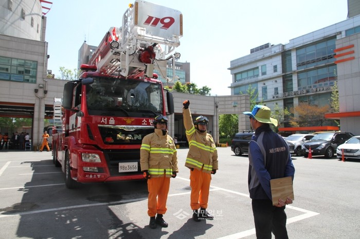 최근 동작소방서는 본서 차고 앞에서 고가사다리차와 화학차를 이용한 '2016년 특장소방차 운용능력 경연대회 평가'를 실시했다. 사진은 소방서 관계자들이 훈련을 진행하는 모습.(사진제공=동작소방서)