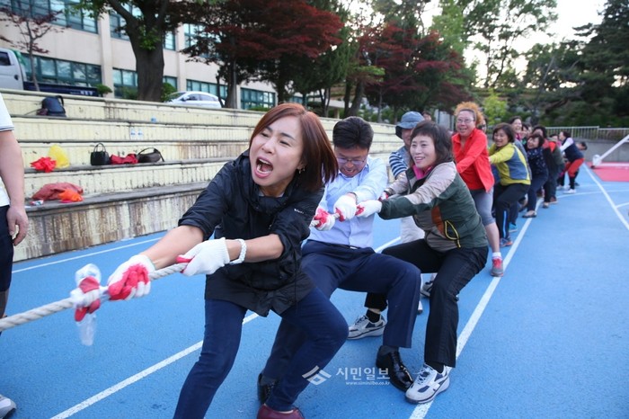 최근 서초구 방배3동 주민들이 오는 21일 반포종합운동장에서 개최 예정인 '2016 서초구민 체육대회'를 앞두고 상문고 운동장에서 줄다리기 연습을 하며 안간힘을 쓰고 있다.(사진제공=서초구청)