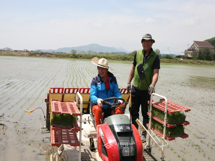 최근 한국농촌지도자 김포시연합회가 대곶면 약암리 862번지 외 4필지(1만9795㎡)에 위치한 공동운영답에서 모내기를 실시했다. 사진은 박동균 부시장(왼쪽)이 이앙기로 모내기를 하고 있는 모습.(사진제공=김포시청)
