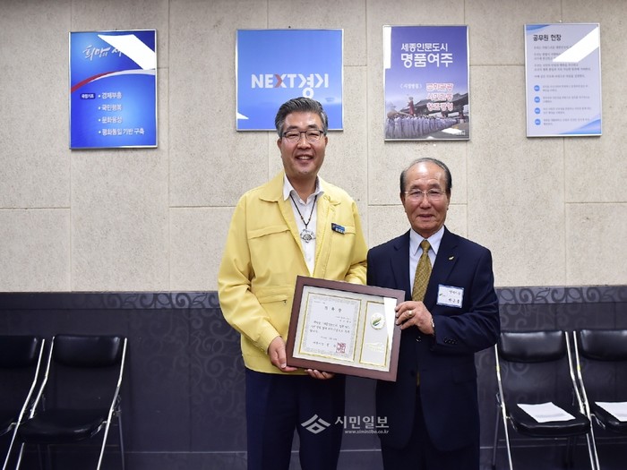 지난 16일 경기 여주시는 시청상황실에서 박근출 여주시 독립운동가 기념사업회 회장을 일일명예시장으로 위촉했다. 사진은 원경희 시장(왼쪽)과 박 회장이 위촉장을 나눠들고 기념촬영하는 모습.(사진제공=여주시청)