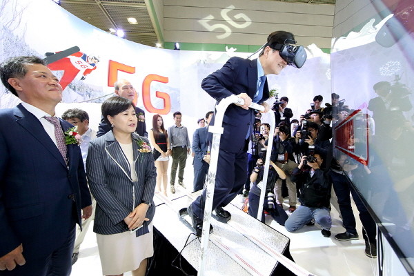 KT는 17일부터 20일까지 나흘간 서울 코엑스(COEX)에서 열리는 국내 최대 정보통신박람회 ‘WORLD IT SHOW 2016(이하 WIS 2016)’에 참가해 ‘완벽한 네트워크를 기반으로 미리 만나는 5G 올림픽’ 주제로 전시관을 운영한다. 사진은 미래창조과학부 최양희 장관이 KT전시관을 방문해 스키점프대에서 VR을 체험하고 있다.