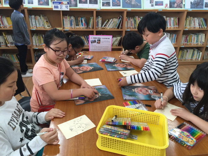 지난 16일 경기 부천시 동산초등학교는 꽃동산꿈동산 도서관에서 ‘장수탕 선녀님과 만나요’라는 제목으로 도서관 행사를 실시했다. 사진은 학생들이 '장수탕 선녀님' 책을 읽고난 뒤 이어질 이야기를 상상하며 이야기책을 만드는 모습.(사진제공=부천교육지원청)