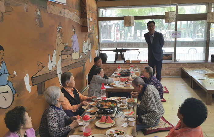 지난 17일 경기 수원시 팔달구 화서2동 '나누미&베푸미' 사업장 제3호점 들마루에서 노인에게 맛있는 음식을 대접하는 행사를 가졌다. 사진은 행사에 참석한 노인들이 식사하는 모습.(사진제공=팔달구청)