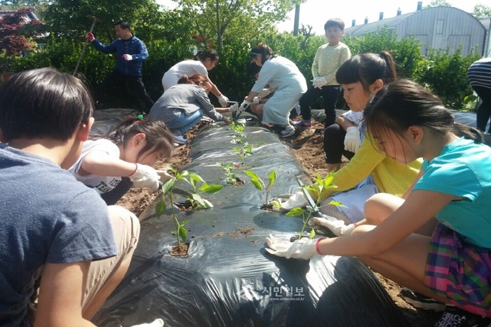 지난 17일 전남 장흥 장평초등학교는 친환경 건강 학교를 만들어 학생들에게 올바른 인성과 정서 발달에 도움을 주는 교육을 실시하고자 교내에서 ‘텃밭 가꾸기’ 체험활동을 실시했다. 사진은 학생들이 텃밭에 모종을 심고 있는 모습.(사진제공=장평초등학교)