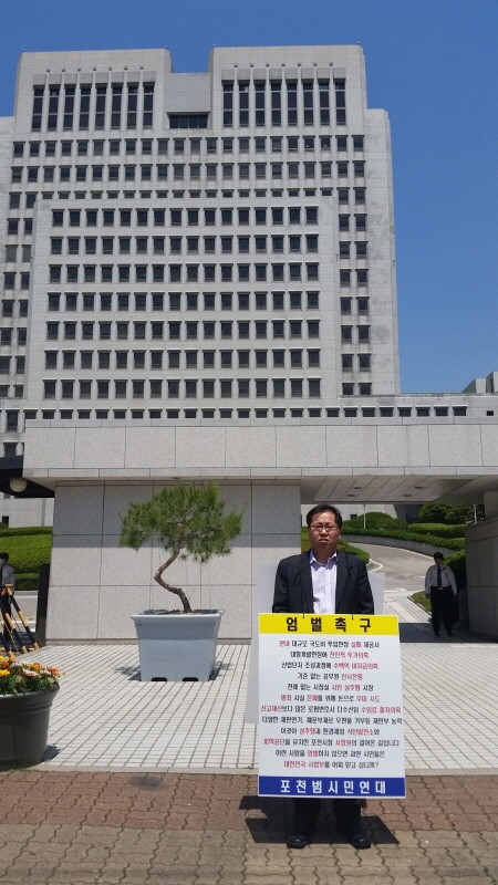 현수민 포천범시민연대 사무국장이 18일 서울 서초구 대법원 앞에서 서장원 포천시장에 대한 갖가지 의혹을 제기하며 엄벌을 촉구하는 내용의 1인 시위를 하고 있다.