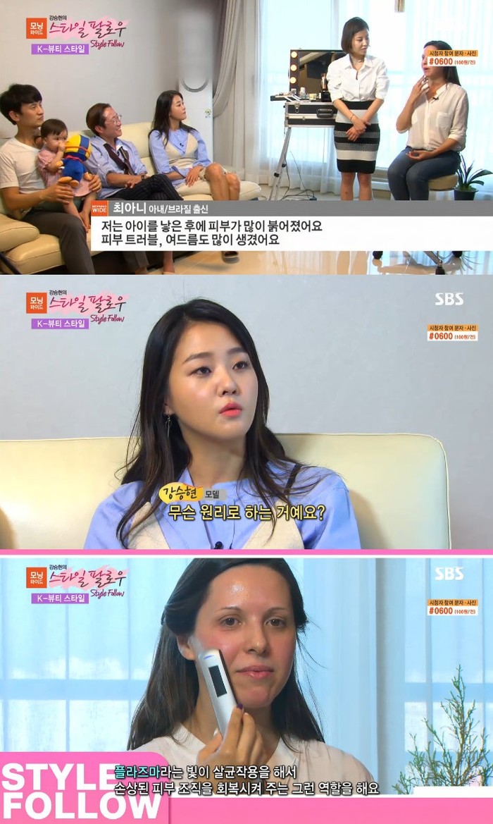 이에 대해 김수빈 메이크업 아티스트는 홈스킨케어 기구를 선보이며 “기구를 피부에 대면 플라즈마라는 빛이 발생한다. 플라즈마라는 빛이 살균작용을 해 손상된 피부 조직을 회복시켜 주기 때문이다. 제품을 발랐을 때 흡수나 보습을 높여준다”고 팁을 전했다.
