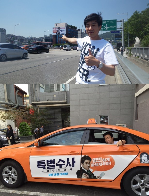 사진에서 김명민은 '특별수사: 사형수의 편지' 포스터가 붙어있는 택시 안에서 카메라를 응시하는가 하면, 영화 광고판을 손으로 가리키고 있다.