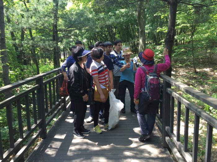 지난 18일 서울 구로구는 외부활동의 기회가 자주 없는 장애인을 위해 복지위원 19명이 동행해 양지골장애인주간보호시설 장애인 13명과 2인 1조로 매봉산 산책로를 걷는 숲길여행 나들이 봉사를 실시했다. 사진은 참가자들이 숲해설가의 숲 이야기를 듣는 모습.(사진제공=구로구청)