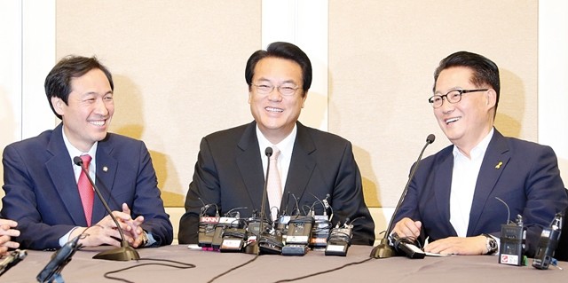 새누리당 정진석 원내대표(가운데), 더불어민주당 우상호 원내대표(왼쪽), 국민의당 박지원 원내대표가 19일 오후 국회 귀빈식당에서 열린 20대 원구성 협상을 위한 첫 회의를 열고 있다.