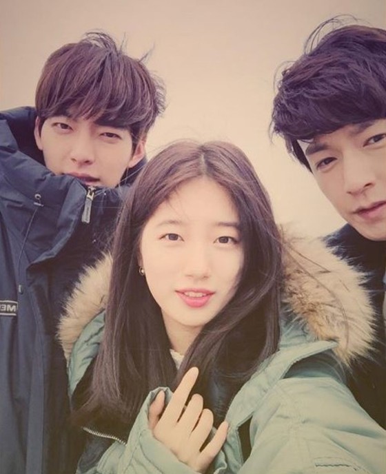 공개된 사진 속 수지는 배우 김우빈, 임주환과 다정하게 카메라를 응시하고 있다. 특히 세 사람의 훈훈한 외모가 보는이들의 시선을 사로잡고 있다.