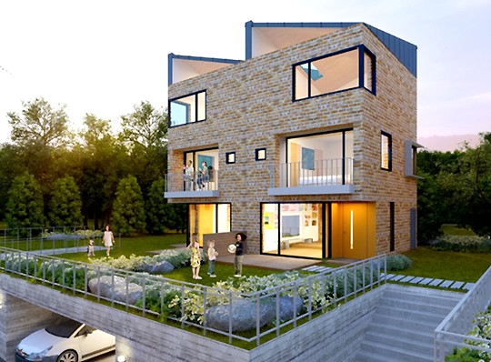 1층에 거실겸주방, 욕실, 그리고 2층에는 침실, 드레스룸, 욕실, 부부테라스가 설계되었으며 3층에는 욕실, 자녀방2(가변벽체) 확장가능하도록 설계되어 있다.