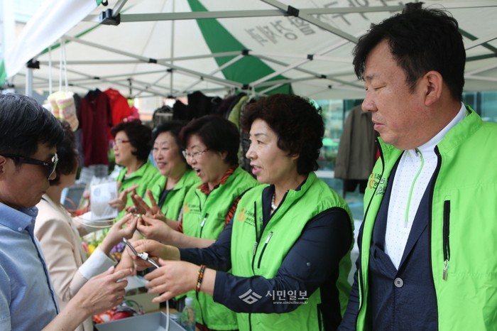 서울 관악구의회 의원들이 지난 20일 자원봉사활동 릴레이 운동 '날개를 단 자원봉사, 날자'의 일환으로 구청 광장에서 열린 환경사랑 나눔장터에 참여해 재활용품을 판매하고 있다. 사진은 (오른쪽부터) 장현수 의원, 주순자 의원, 김정애 의회운영위원장, 백성원 의원, 곽광자 의원.(사진제공=관악구의회)